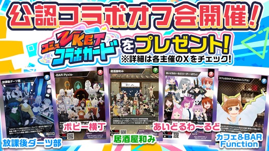 公認コラボオフ会では、各団体が趣向を凝らした企画を用意、来場者特典として各オフ会主催コミュニティの「Vketコミュコラボトレカ」もプレゼントします。また、VketRealのチケットを購入している方向けに、各オフ会の入場料割引や無料ドリンクなどの特典を用意していただいています。詳細は公式HPや主催者のX(旧Twitter)などをご覧ください。