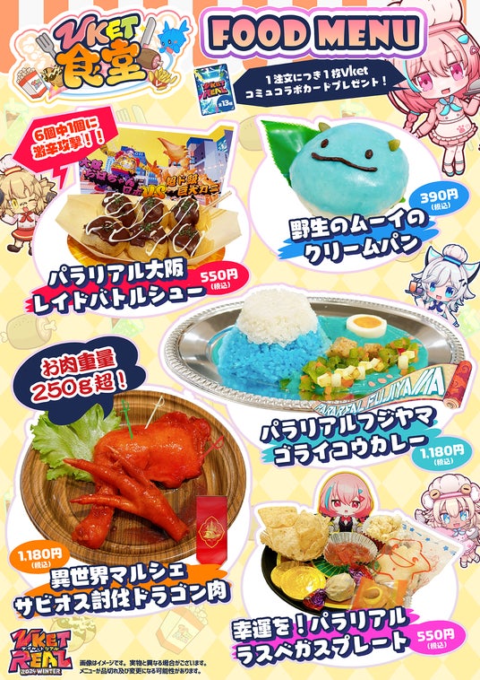 他にも、人気マスコットキャラクター「ムーイ」をかたどった『野生のムーイのクリームパン』や、『異世界マルシェ討伐ドラゴン肉』)、『幸運を!パラリアルラスベガスプレート』など、VketRealならではのフードメニューを多数ラインナップします。