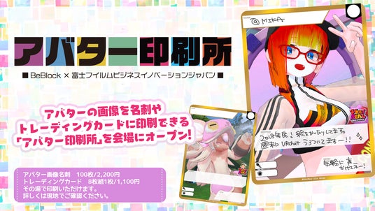 富士フイルムビジネスイノベーションジャパン株式会社と株式会社BeBlockは、アバターの画像を名刺やトレーディングカードに印刷できる「アバター印刷所」を会場にオープンします。
