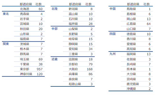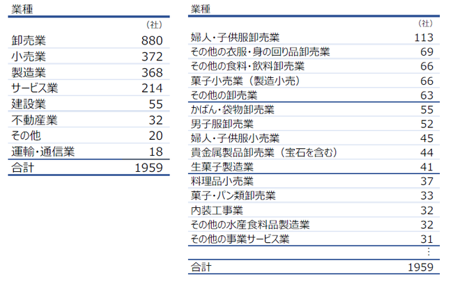 そごう・西武を販売先としている事業者は全国に1959社あることが判明。業種別では大分類で「卸売業」(880社)、細分類では「婦人・子供服卸売業」(113社)が最多。都道府県別では「東京都」(957社)、「大阪府」(168社)、「神奈川県」(120社)の順