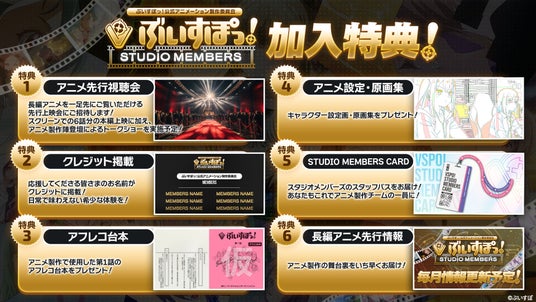 STUDIO MEMBERS加入特典として、アニメ先行上映イベントへの招待・クレジットへの名前掲載・アフレコ台本やアニメ設定資料、原画集の提供など