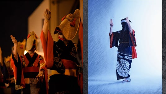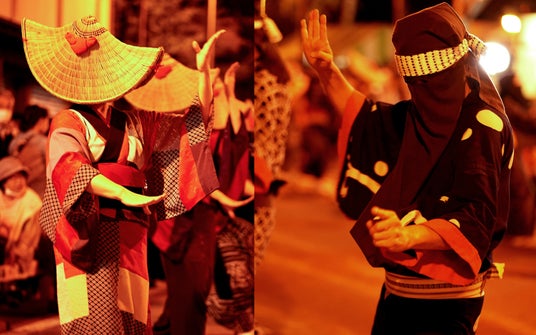 羽後町は秋田県南部に位置し、周囲を山に囲まれた県内屈指の豪雪地帯です。同地で700年以上受け継がれた「西馬音内盆踊り」は、亡者を思わせる彦三頭巾に藍染めの浴衣や深くかぶった編み笠に艶やかな端縫い衣装でかがり火の周りを優雅にそして流麗に踊ります。編み笠や彦三頭巾で顔が隠れているため、踊り手の姿勢や手先の美しさが際立つ伝統芸能です。2022年11月にはユネスコ無形文化遺産に登録されました。