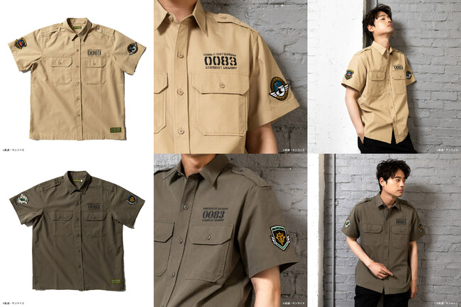 コットンナイロン素材を使用し両胸にはフラップ付きのポケット、肩にはエポーレットが付いた、タフで少し無骨な半袖ミリタリーシャツです。ベージュの生地にトリントン基地をモチーフとしたワッペンを両袖に配置し、左胸ポケットの上にロゴプリントを施したE.F.S.F.モデル。カーキの生地にデラーズ・フリート率いるジオン公国軍をモチーフとしたワッペンを両袖に配置し、左胸にロゴをプリントしたZEON FORCESモデルの2種展開。