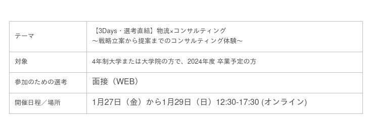 ロジスティクス・物流コンサルティングサービスを提供する船井総研ロジ株式会社(東京本社:東京都千代田区、代表:菅重宏、以下「船井総研ロジ」)は、2023年1月27日(金)から1月29日(日)に2024年卒の学生向けに「物流×コンサルティング:戦略立案から提案までのコンサルティング体験」と題して、冬のインターンシップを開催いたしました。