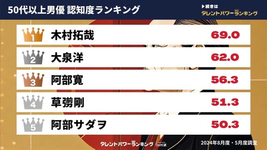 『タレントパワーランキング』では、タレントパワーランキングに登録されている50代以上の男優について、Z世代(10代~20代前半の男女)における認知度を調査。