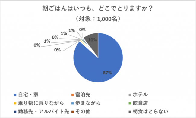 朝ごはんは、自宅・家でとると回答した人が87%となっており、9割近くの人が朝ごはんは、自宅や家で食べていることが分かりました。