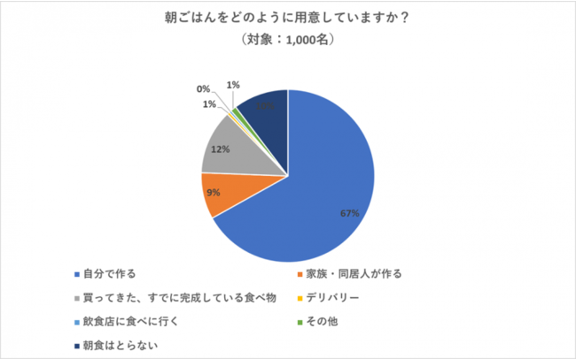 アンケート対象者が主婦中心ということもあり、朝ごはんは自分で用意している人が67%という結果になりました。「家族や同居人が作る」と回答した人は9%にとどまっています。