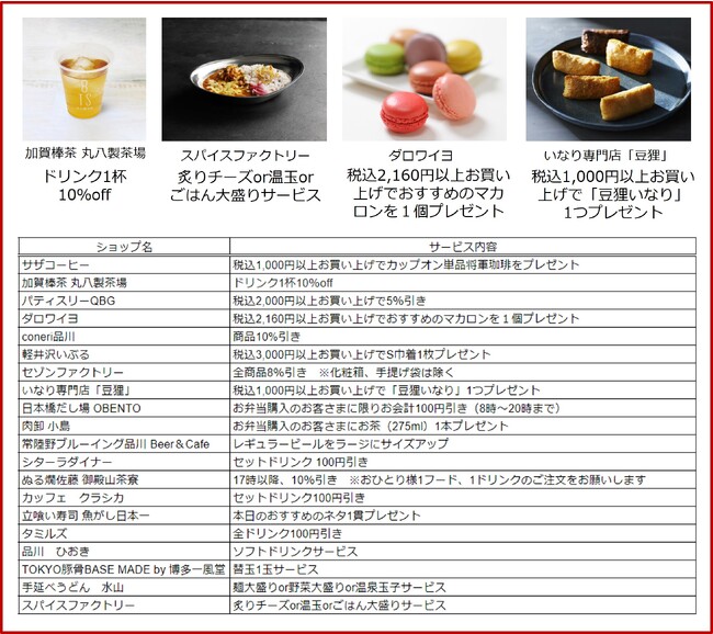品川駅周辺対象施設の当日ご利用の領収書等をご提示のうえ、エキュート品川の対象ショップでお買い物やお食事をすると、お得なサービスが受けられる『わくトク品川』がスタートします。