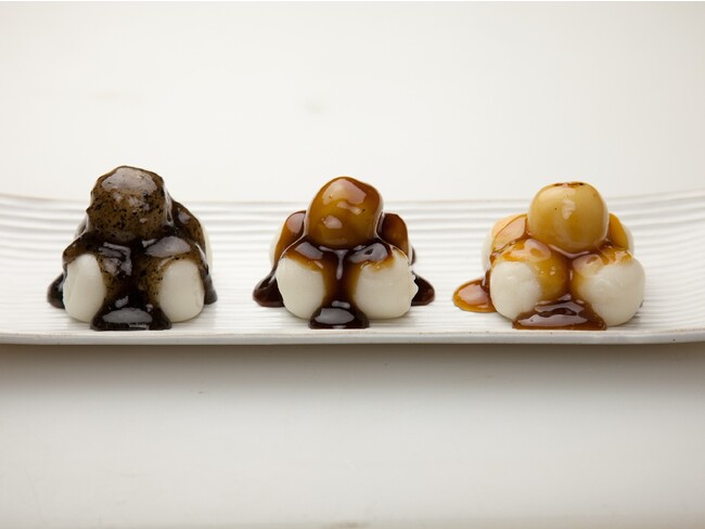 みたらし、あやめ、ごまの3種類のたれを使ったお団子。たれには本葛を使用しています。