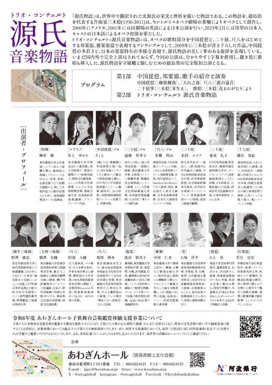 「トリオ・コンチェルト 源氏音楽物語」は徳島県を代表する作曲家・三木稔氏のオペラ「源氏物語」を、より繊細に華やかに、邦楽器と雅楽楽器、中国琵琶のために三木氏本人が書き下ろした渾身の邦楽アンサンブル作品。