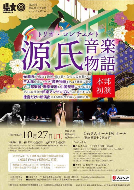 徳島県民文化祭開催委員会が県内の文化・芸術活動の活性化のため、毎年行っている徳島県民文化祭の今年のメインプログラムが「源氏物語」を題材とした邦楽アンサンブル「トリオ・コンチェルト 源氏音楽物語」に決定した。