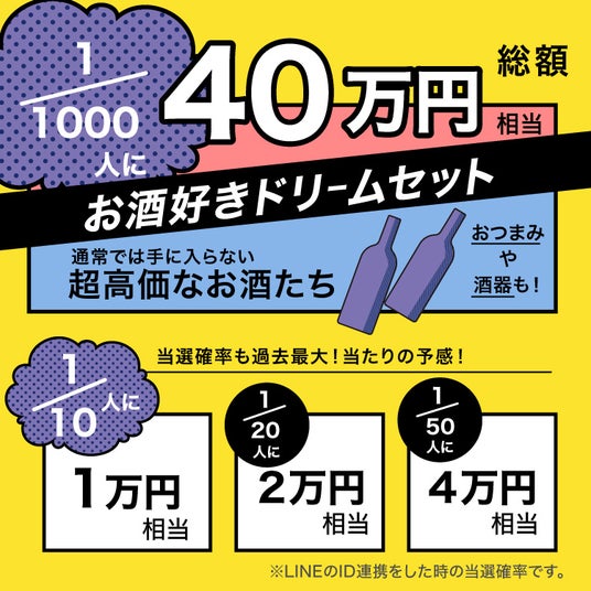 「40万回記念酒ガチャ」をご購入のお客さまを対象に、通常販売されていない希少なお酒などが入った40万円分の夢のセットが当たる抽選キャンペーンです。1本110,000円(税込)の50年熟成酒粕焼酎「神響 shinkyo 50年」や、1本55,000円(税込)の30年熟成させた日本酒「天琥 -tenko- 30年」などが入った贅沢なセットが当たります。