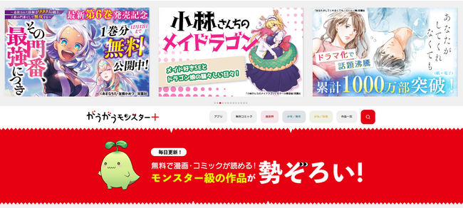 この度、12月1日よりは『小林さんちのメイドラゴン』『あなたがしてくれなくても』『島さん』などアニメ化やドラマ化もされた人気作が新たに追加され、サイト名を「がうがうモンスター+(プラス)」と変更して、大きくリニューアルされました。