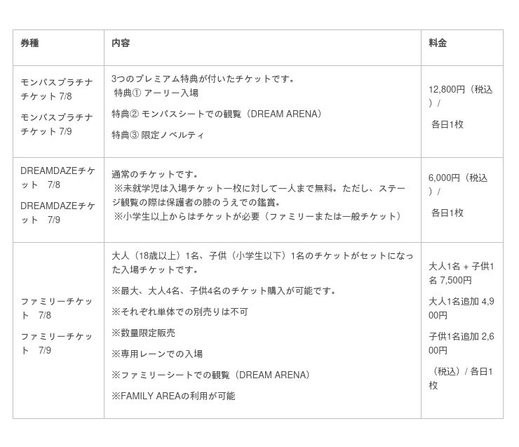 ・販売券種 :1.DREAMDAZEチケット 2.ファミリーチケット