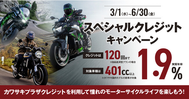 株式会社カワサキモータースジャパン(本社:兵庫県明石市、代表取締役社長:桐野 英子)が展開するカワサキプラザネットワークでは、2023年3月1日(水)~2023年6月30日(金)までの期間中、カワサキ プラザで対象の401cc以上モーターサイクル新車をご購入時に実質年利1.9%でご利用いただける「カワサキプラザ スペシャルクレジットキャンペーン2023」を実施いたします。