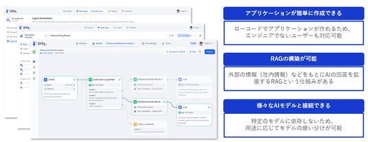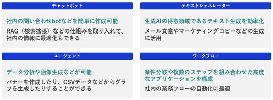 GPTやGeminiなどのAIモデルとチャットボットなどを組み合わせてアプリケーションを作成できるサービスです。非エンジニアの社員の方でも簡単にローコードで作成し、業務フローの自動化が可能となります。外部データと連携するRAG(検索拡張)機能を持つため、企業の内部情報を利用することもできます。