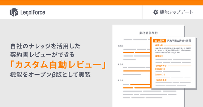 株式会社LegalOn Technologies(本社:東京都江東区、代表取締役執行役員CEO:角田 望、以下 LegalOn Technologies)は、AI契約審査プラットフォーム「LegalForce」において、自社のナレッジを活用した契約書レビューができる「カスタム自動レビュー」機能をオープンβ版として実装しました。これにより、ユーザーは自動レビューの審査基準に加えて、独自の審査基準を設定でき、自社基準に沿った契約書レビューの実施、それによる契約審査業務の効率化と会社としての契約審査基準の標準化が可能になります。