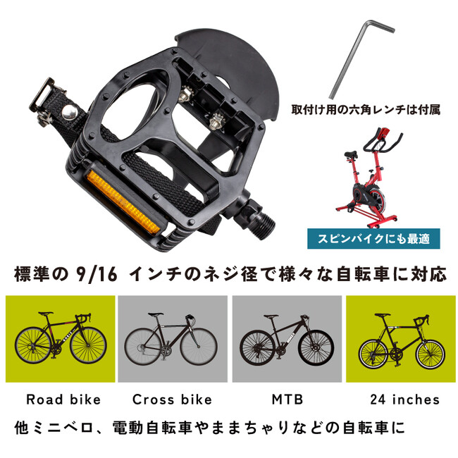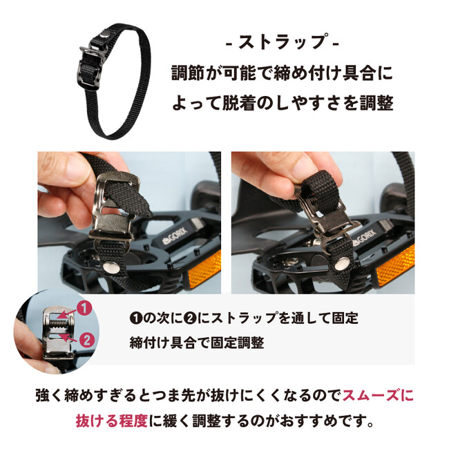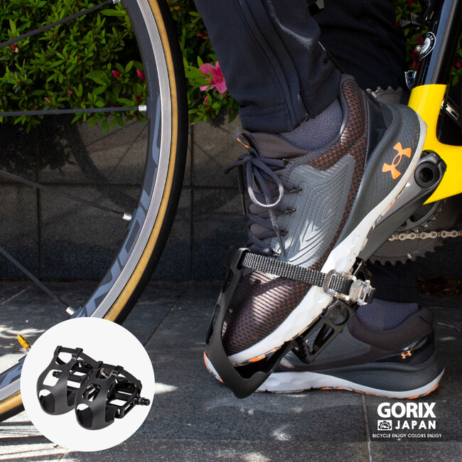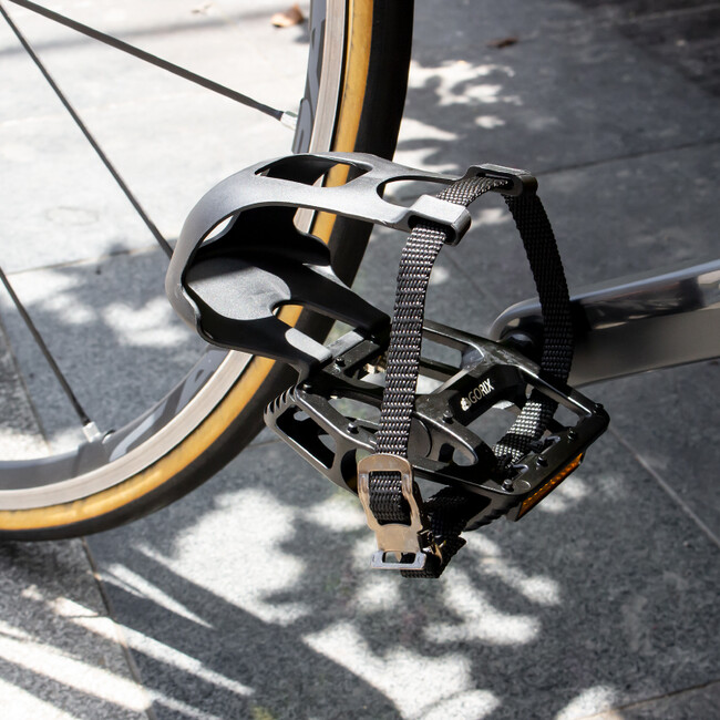 トゥークリップ、ストラップに対応するペダルを選ばなくてもOKですぐに装着して使える。