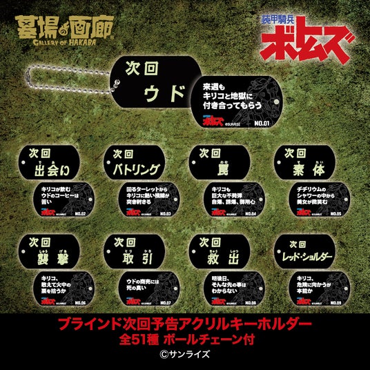 「リアルロボットアニメの頂点」と言わしめる傑作『装甲騎兵ボトムズ』のハードボイルドな世界観を決定付けた「次回予告」全51話のサブタイトルを、全種アクリルキーホルダー化!裏側には血と硝煙の匂いが燻る、各話の次回予告名ゼリフをプリント!思い出深い1枚を選ぶか?全話コンプリートを目指すか?キリコと地獄へ付き合え!