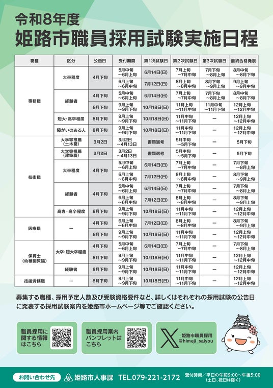 令和8年度の姫路市職員採用試験の実施日程をお知らせします。募集する職種、採用予定人数及び受験資格要件など、詳しくはそれぞれの採用試験の公告日に発表する案内を姫路市ホームページ等でご確認ください。
