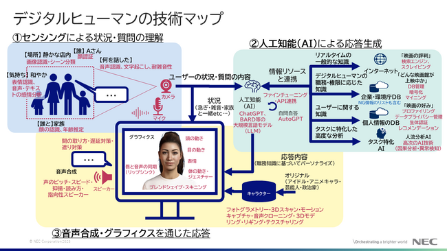 NECは、2023年4月に有志企業8社とともにデジタルヒューマン(注1)の社会実装を目指す「デジタルヒューマン協議会」を設立し、計6回の会合の中で「デジタルヒューマンの利活用」について議論を重ねてきました。協議会では、参画各社が持ち回りで「自社の技術/取り組み」「デジタルヒューマンの活用可能性」「AIを活用したビジネス展開」について発表し、人々の生活に今後深く関与することになると予測されるデジタルヒューマンについて、適切かつ効率的に活用されるよう検討しており、ユースケースを社会に提示することを目指しています。