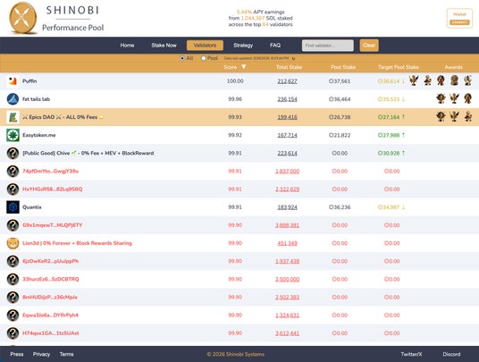 Shinobi Performance Pool のランキングは、vote 成功率、vote レイテンシ、スキップ率、ブロックあたりの Compute Units など、バリデータの実処理性能を総合的に評価するスコアリングシステムです。