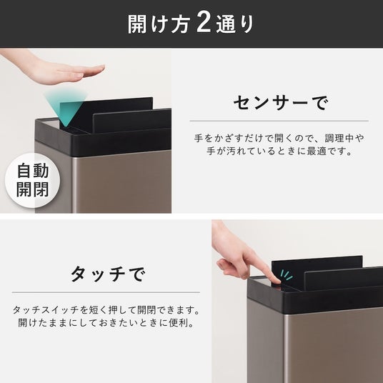 センサー式で蓋が自動開閉するため、調理中など両手が塞がっている時でも衛生的。