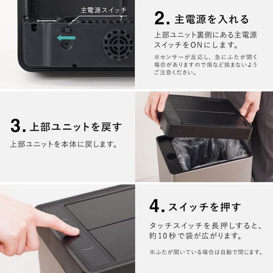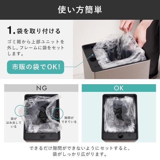 袋をセットしてボタンを押すだけで、静電気で貼り付きがちな袋もしっかり広がり、手作業の煩わしさを解消します。