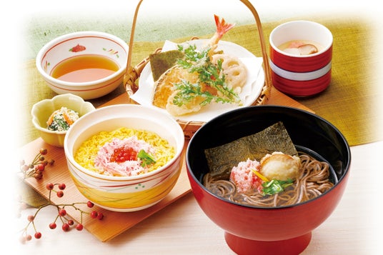 「紅ずわいがに、あわび、いくら、数の子」など旬のネタのほか、人気のサーモンやまぐろ、甘えびなども楽しめる年末年始にぴったりのお寿司の和膳です。天ぷらとそば/うどん、茶碗蒸しもセットです。