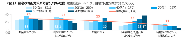 自宅の防犯対策ができていない理由として、「お金がかかる」は40代で、「何をすればいいかわからない」は、30~40代、「面倒」は60代で多い。「自宅周辺は治安がよく安心」は年代が上がるほど高まり、70代では37%に達する。<図2>