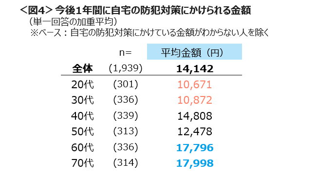 今後1年間で防犯対策にかけられる金額を聴取した。全体の平均は14,142円であり、金額の高い60~70代は18,000円に近く、低い20~30代は11,000円に届かない額であった。<図4>