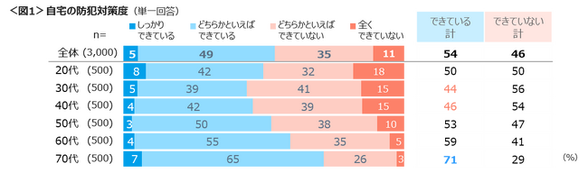 自宅の防犯対策ができているかを確認したところ、「しっかり+どちらかといえばできている」が54%、「全く+どちらかといえばできていない」が46%と「できている」家庭の方が若干多い。70代は「できている」割合が71%と高く、30~40代は40%台にとどまる。<図1>