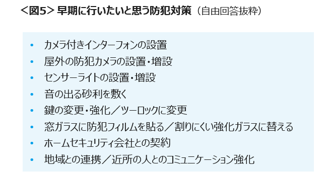 早期に行いたい防犯対策は、「カメラ付きインターフォンの設置」「屋外の防犯カメラの設置・増設」「センサーライトの設置・増設」「窓ガラスに防犯フィルムを貼る/割りにくい強化ガラスに替える」「ホームセキュリティ会社との契約」などの声が目立った。<図5>