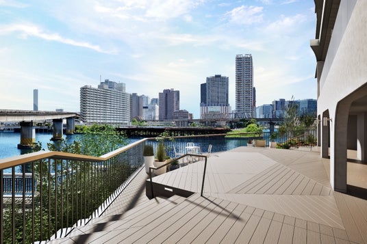 本物件には、エントランスホールと繋がる屋外共用空間としてリバーサイドデッキを設けています。運河を望みながらリラックスした時間を過ごして頂くことをイメージし、家具や植栽も設置しました。