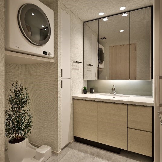 全戸の洗濯機置き場上部空間にガス衣類乾燥機「乾太くん」を設置することで、時短・家事楽ニーズに応えるだけでなく、バルコニーの物干し金物をなくし、ゆとりあるバルコニー空間を実現しました。