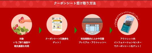 ※対象いちご狩り施設で配布する「クーポンシート引換券」をふかや花園プレミアム・アウトレット内インフォメーションセンターにご提示ください。