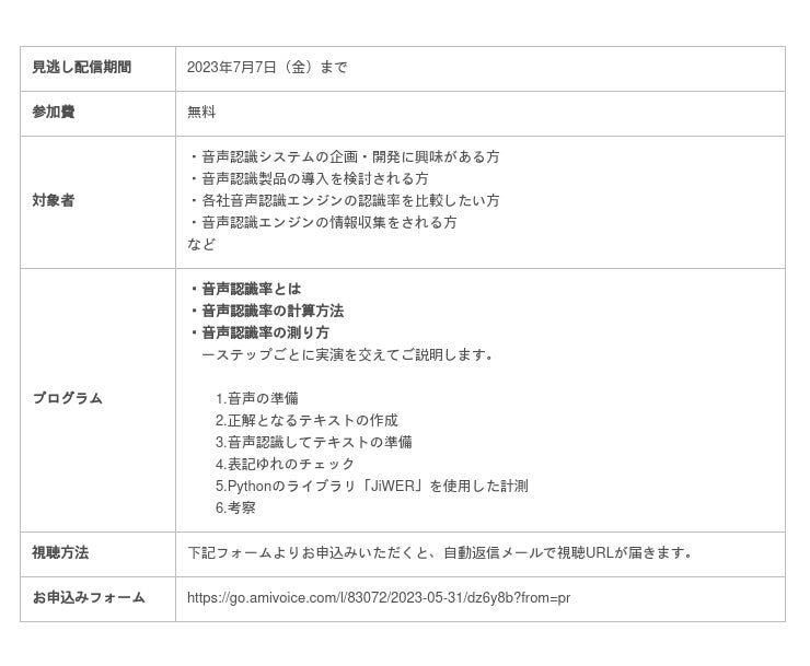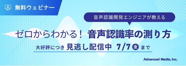 株式会社アドバンスト・メディア(本社:東京都豊島区、代表取締役会長兼社長:鈴木清幸 以下、アドバンスト・メディア)は、6月12日(月)~7月7日(金)の間、5月25日(木)に開催しご好評いただいたオンラインセミナー「音声認識開発エンジニアが教える~ゼロからわかる!音声認識率の測り方~」の見逃し配信を実施いたします。