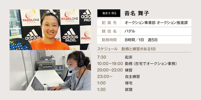 デュアルキャリアで入社してから約1年半が経ちました。オークション推進課の皆様には、日々競技の関係で柔軟に対応していただいております。競技をすることを優先しても周囲が協力して業務を回してくださったり、応援してくれているので非常に働きやすい環境です。今までに3度海外に行きましたが、たくさんの方に臨機応変に対応していただき、長期でお休みをいただいても安心して試合に集中することができました。今後選手としてさらに活躍の場を広げていこうと考えていますが、上司と相談しながら仕事も頑張れる環境で選手活動も頑張りたいと思います。