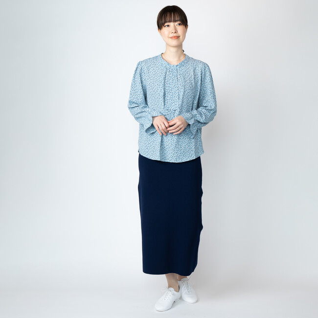 特 長: 学校で着替えるシーンを想定し、肩にファスナーを仕込み、メイクやヘアスタイルが崩れることなく脱ぎ着しやすいデザインにしました。気になる二の腕周りをカバーする少し動きの出るボリューム感のあるデザイン、1年中着用できる肘あたりまでの袖丈にしました。横にスリットを入れ後ろの丈を長くすることで、しゃがんでも下着が見えないように設計しました。