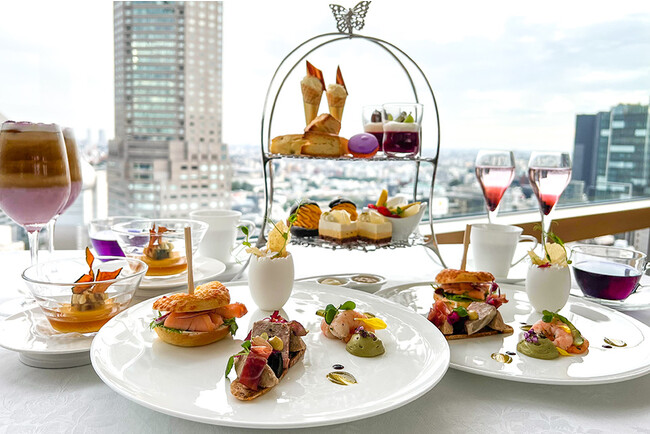 フレンチシェフが手掛けたセイボリー※1は、絵画のように美しく盛り付けたプレートでお届けいたします。スイーツは、季節の野菜やフルーツを使ったプチフールやグラスデザートを2段のティースタンドに端正に盛りつけました。ベルビューシートからの眺望に溶け込むティースタンドと、繊細で美しいセイボリーやスイーツを被写体に、食べることを忘れるくらいフォトタイムに時間を費やしてしまうかもしれません。