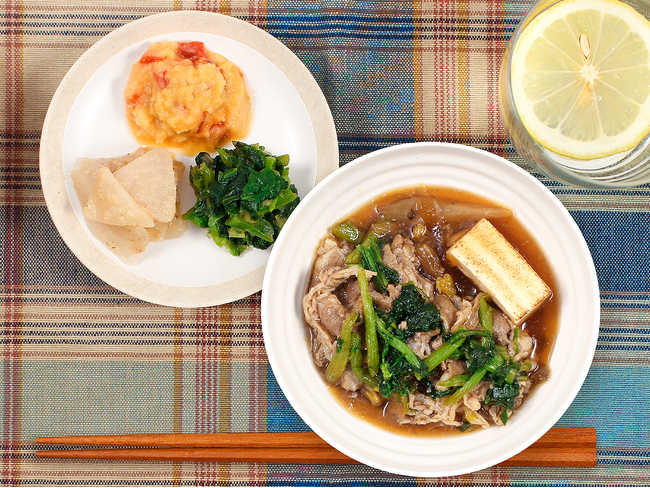 副菜は、かぶとツナの梅あえ、赤ピーマンポテト、菜の花のおろし醤油です。