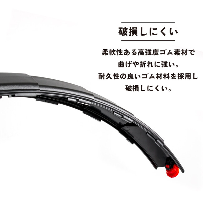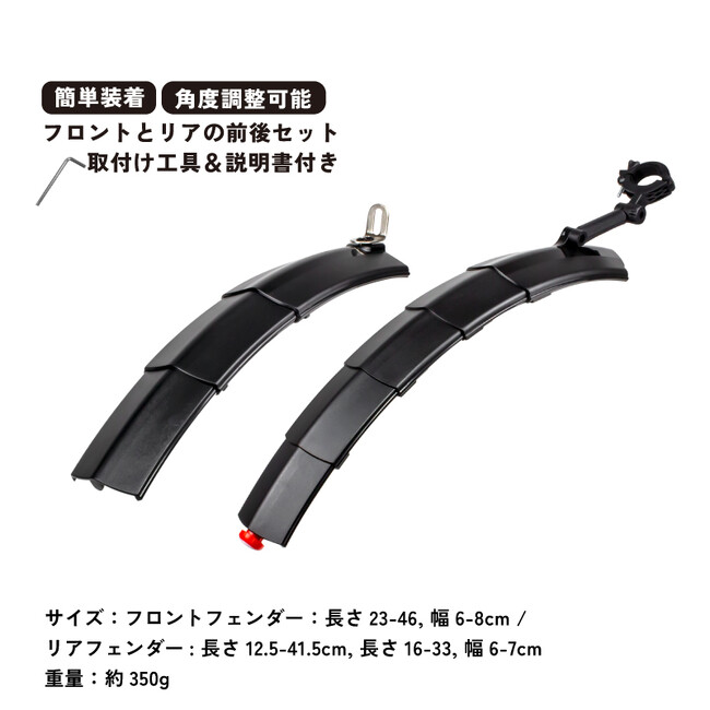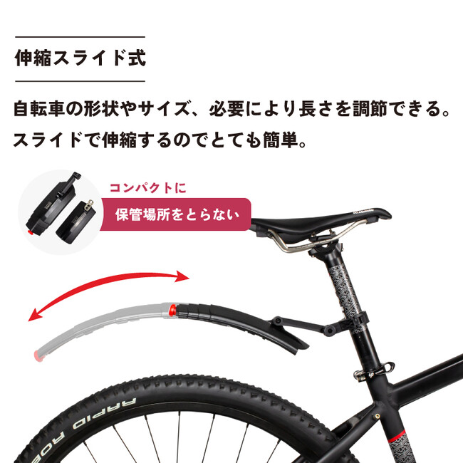 自転車の形状やサイズ、必要により長さを調節可能な伸縮性が特徴の泥よけです。