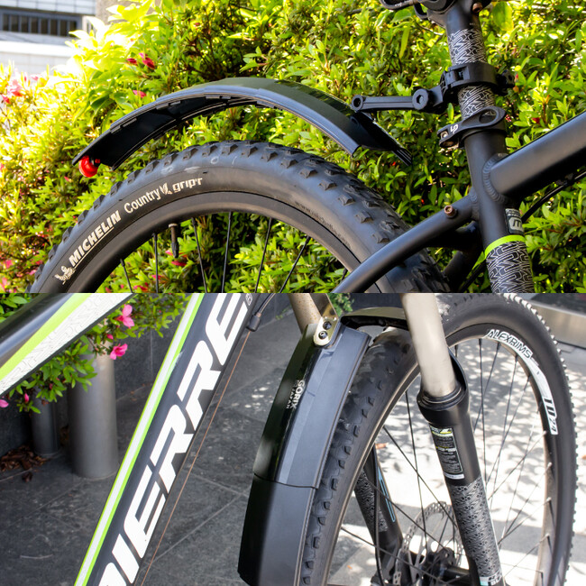 雨などの悪天候や路面がウェットの時に前輪や後輪から跳ね上げられる泥、雨水をお尻や背中にかかるのを防ぐアイテムです。フロント、リアともにスライドで伸縮可能な可変式となっているのが特徴です。