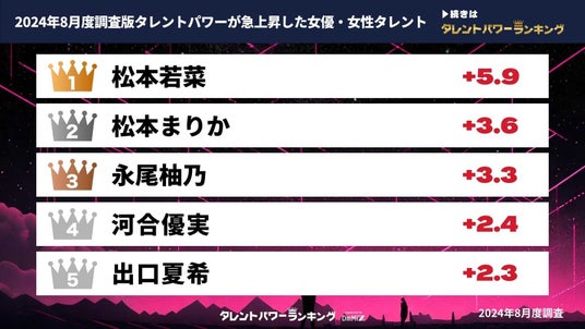 2024年8月度調査版 タレントパワーが急上昇した女優・女性タレントランキング