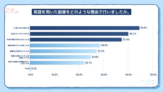 現在までに英語を活用した副業経験が「ある」と答えた回答者に、副業を行った理由について尋ねたところ、1位は「より高い収入を得るため」(44.6%)、2位は「自身のキャリアアップのため」(40.1%)、3位は「自身の英語力を向上させたいため」(37.