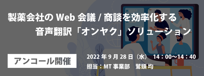 「英語は話せるが、ヒアリングが追いつかない」「英語の理解度に個人差があり、認識のズレが生じる」「海外研修動画を日本語で視聴できたらなあ」 「とにかく議事録が大変!」「リモートワークのため以前のように英語堪能者に頼れなくなった」など、 このような医薬業界の現場の課題を解決するため、本ウェビナーではリアルタイムに音声をテキスト化/翻訳してくれる音声翻訳「オンヤク」の実演と活用事例をお届けします。