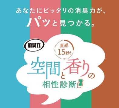 オススメの消臭力を提案する診断コンテンツ「直感15秒!空間と香りの相性診断」をキャンペーンと同時に公開します。使用場所、理想の空間や香りに関する3つの質問に答えていただくだけで、お客様にピッタリの消臭力をご提案します。