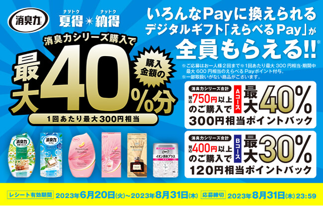本キャンペーンは、キャンペーン期間中に「消臭力」シリーズ全品より、それぞれの応募コースに必要な金額を購入の上、WEBから応募することで購入金額の最大40%分のデジタルギフト”えらべるPay”が全員もらえるキャンペーンです。Aコースは税込み750円以上購入でえらべるPay300ポイント、Bコースは税込み400円以上購入でえらべるPay120ポイントが受け取れます。
