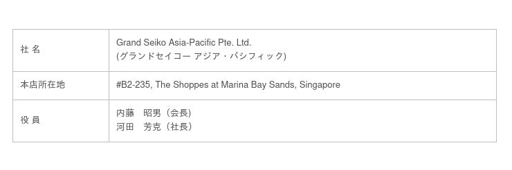 この度設立した「Grand Seiko Asia-Pacific Pte. Ltd. (グランドセイコー アジア・パシフィック)」は、セイコーウオッチとThong Sia Watch (Far East) Co. Ltd.の合弁会社となる予定で、セイコーウオッチ取締役会長の服部 真二とThong Sia Watchグループ会長のJoseph Wong氏が、共同名誉会長に就任する予定です。