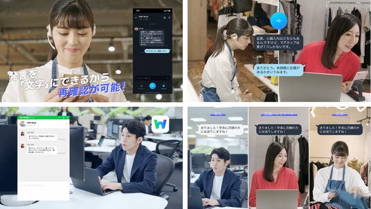 ひとつのアパレル雑貨店を舞台とし、在庫確認をしたい店舗責任者と店舗にいるスタッフ、さらにはバックオフィスのEC担当者が「LINE WORKS」の音声AIを活用したトランシーバーアプリによるシームレスな連携を伝えています。クイックな連携によって販売の機会損失を防ぎ、スムーズに顧客へ商品を提供するまでの新しいビジネスコミュニケーションを実現しています。発言を文字にできるため、手が離せなかった店舗スタッフも振り返りが可能になるほか、「LINE WORKS」とつながることで、音声または文字の、適切なコミュニケーション方法が選択できます。